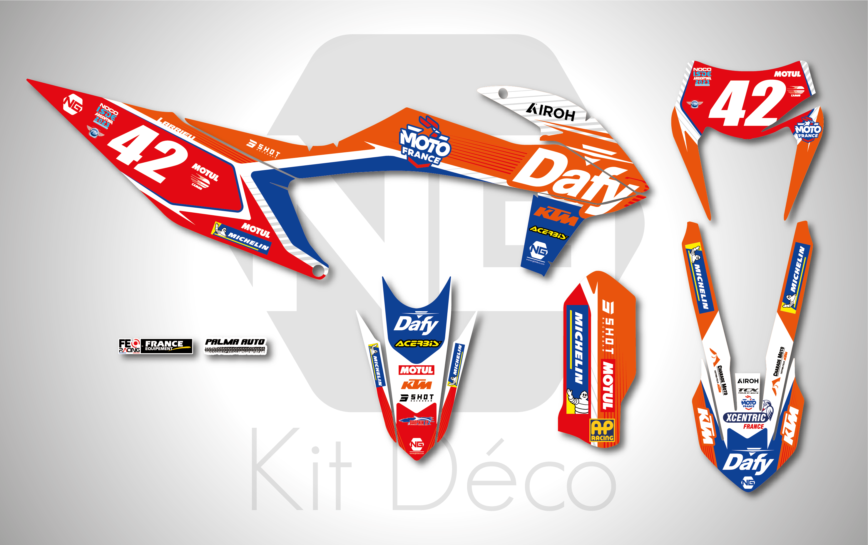 Si votre moto n’est pas dans les modèles disponibles de kit déco de moto d’enduro, n’hésitez pas à nous contacter pour faire votre kit déco ktm.